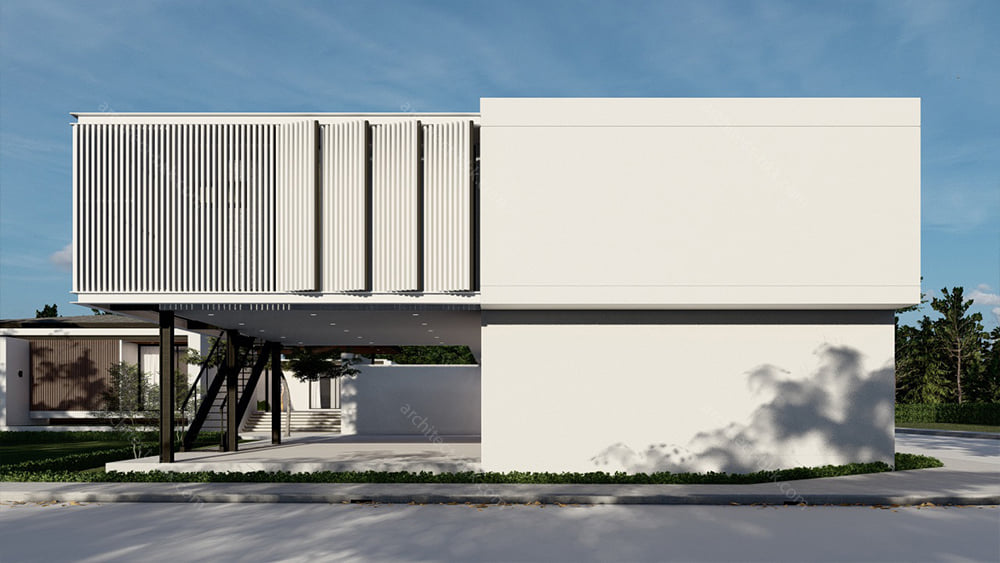 สถาปนิกจึงออกแบบพื้นที่ส่วนที่ติดกับห้องนอนของเจ้าบ้านที่อยู่บนชั้น 2 ให้เป็นพื้นที่เปิดโล่งเชื่อมกับลิฟท์ที่ใช้ยกตัวรถขึ้นมาถึงชั้น 2 ได้ ที่สามารถสร้างความรู้สึกให้เจ้าของบ้านเหมือนได้อยู่ในโชว์รูมรถ และได้ใกล้ชิดกับรถที่เขารักตลอดเวลา ส่วนสถาปัตยกรรมภายนอกออกแบบให้ตัวอาคารมีความเรียบที่สุด เพื่อโชว์จุดเด่นของตัวรถ จึงเกิดเป็นบ้านที่เจ้าของรถสามารถใช้เวลาร่วมกับรถของตัวเองได้มากที่สุด