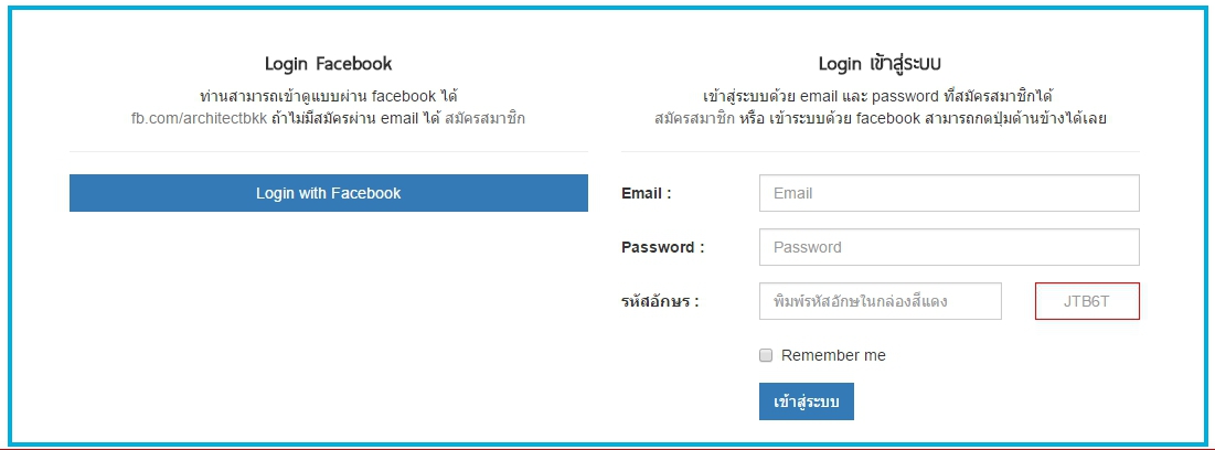 สวัสดีครับ สำหรับการเลือกดูแปลนบ้านใน http://www.architect-bkk.com ระบบกำหนดให้สมาชิกที่สามารถดูแปลนบ้านได้ ต้องเป็นสมาชิกกับทางเว็บก่อน ตอนนี้ทีมงาน IT ได้ เพิ่มช่องทางการเข้าสู่ระบบ ง่ายขึ้นกว่าเดิมสำหรับสมาชิกที่มีบัญชี facebook อยู่แล้ว สามารถเข้าสู่ระบบ login facebook ในฟอร์มด้านซ้ายได้ทันที แต่หากท่านไม่มี บัญชี facebook ก็ยังสามารถเข้าสู่ระบบรูปแบบปกติได้เช่นเดิม โดยการเข้าสู่ระบบผ่าน email และ password สามารถ สมัครสมาชิก ได้ที่นี่ครับ http://www.architect-bkk.com/register.php เข้าสู่ระบบ |  สมัครสมาชิก
